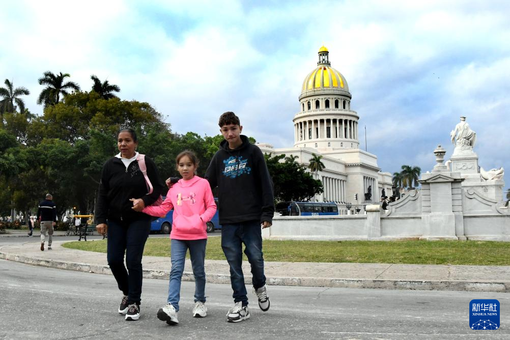 2月3日,在古巴首都哈瓦那,当地民众穿着长袖外套走在街头。 古巴气象研究所2月3日通报,古巴西部马坦萨斯省一处气象站当日7时记录到0摄氏度气温。