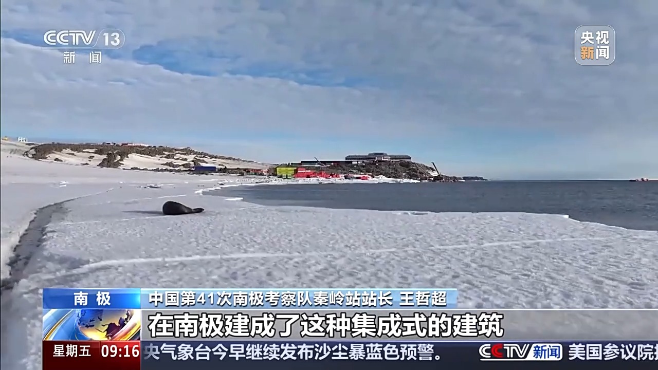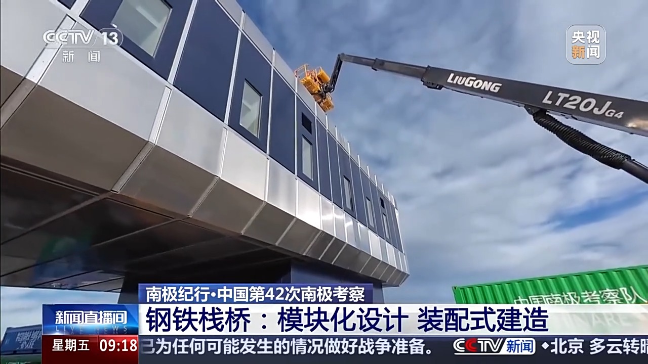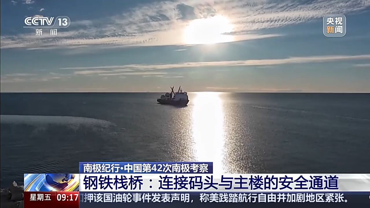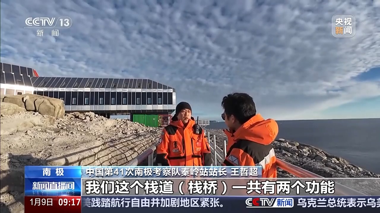 总台央视记者 王善涛:我现在是在南极秦岭站主楼的东侧,这里有一个大平台,从平台往码头看去,有一条钢铁栈桥。这条栈桥,既可以防滑,又可以有效防止产生积雪。