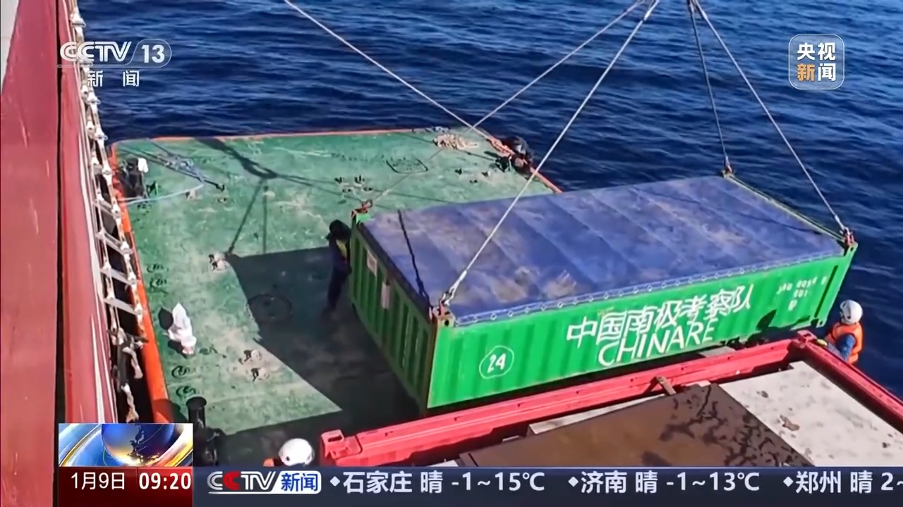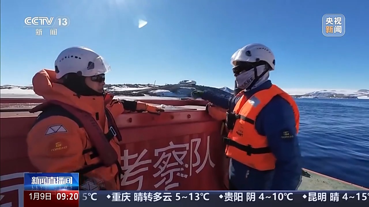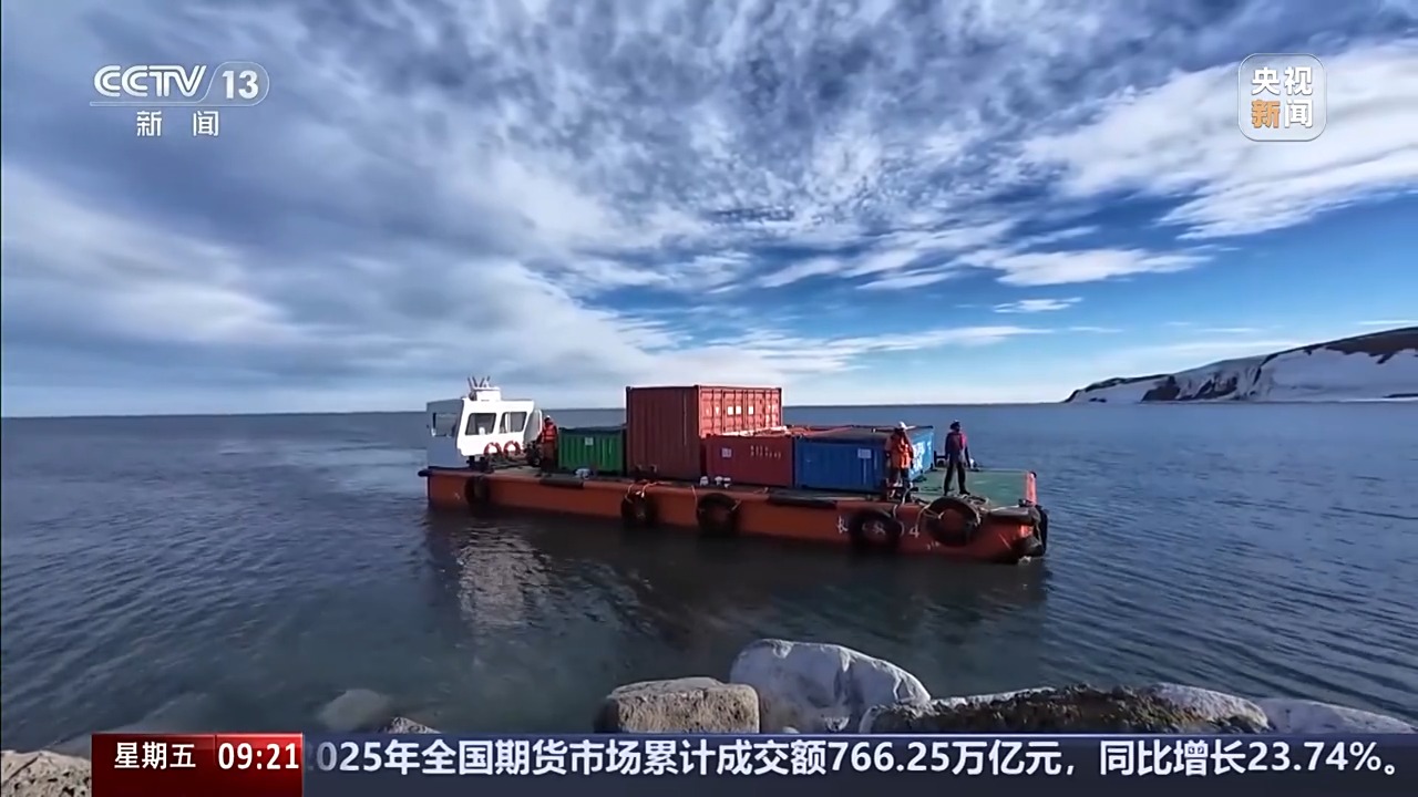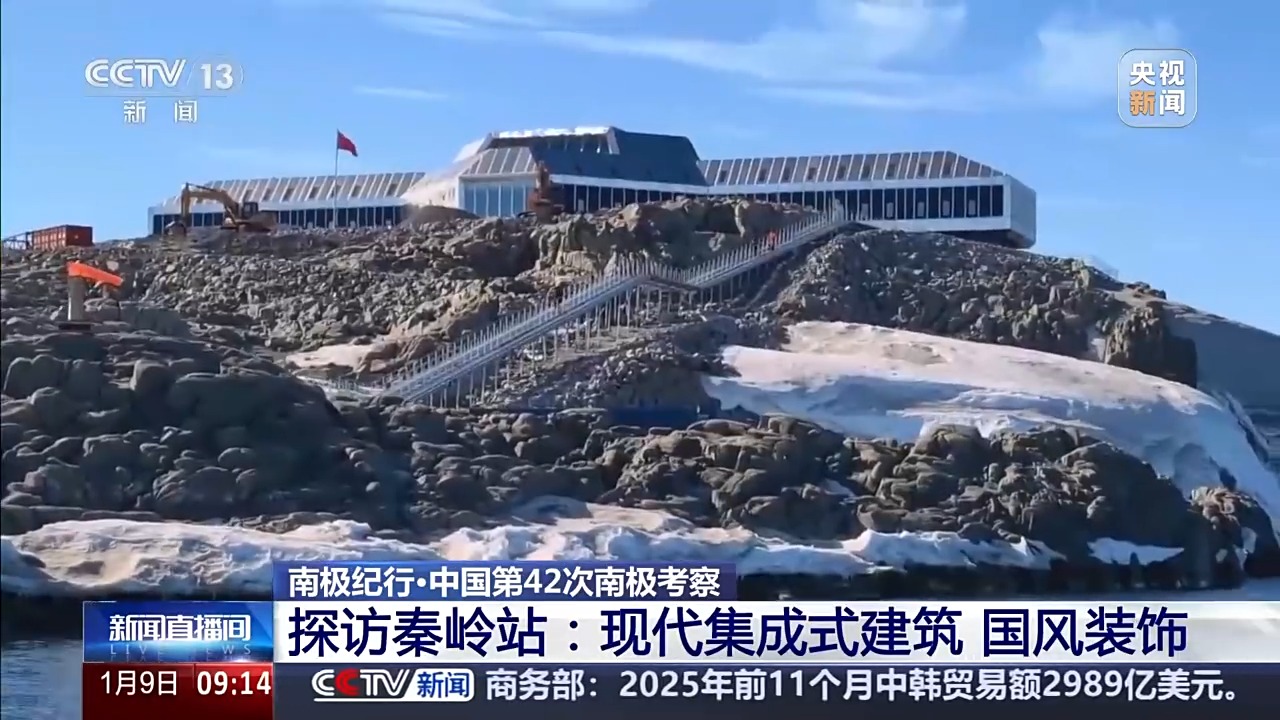 总台央视记者 王善涛:我现在是在南极秦岭站主楼的东侧,这里有一个大平台,从平台往码头看去,有一条钢铁栈桥。这条栈桥,既可以防滑,又可以有效防止产生积雪。