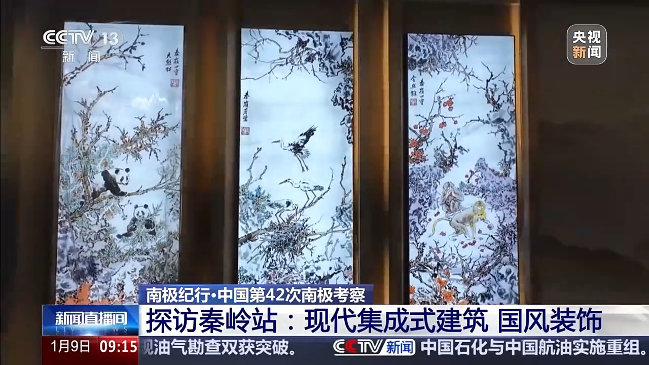 总台央视记者 王善涛:这里是中国南极秦岭站的主楼,进到大门之后,我们就看到“中国南极秦岭站”这个七个大字,大字的两边是六幅画,这种国画的设计使得这里的国风色彩显得非常浓郁。